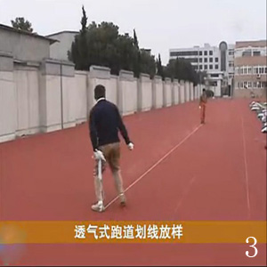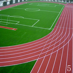 特点:由塑胶黏合废旧橡胶黑颗粒为底层,面层用聚氨酯颗粒与塑胶浆掺混喷涂。透气型塑胶跑道一般主跑道13mm,颜色为红色,辅助区厚度9mm,颜色为绿色。透气型塑胶跑道除具有其它形式的优点外还具有渗水、透气性,也能全天候使用,它是最经济、价格最低廉,而且不会有鼓泡现象发生,同时也减少了地基经费的投入,它适用于建造非正规的中小学田径场地铺设。透气型塑胶跑道使用年限可达到6年以上。