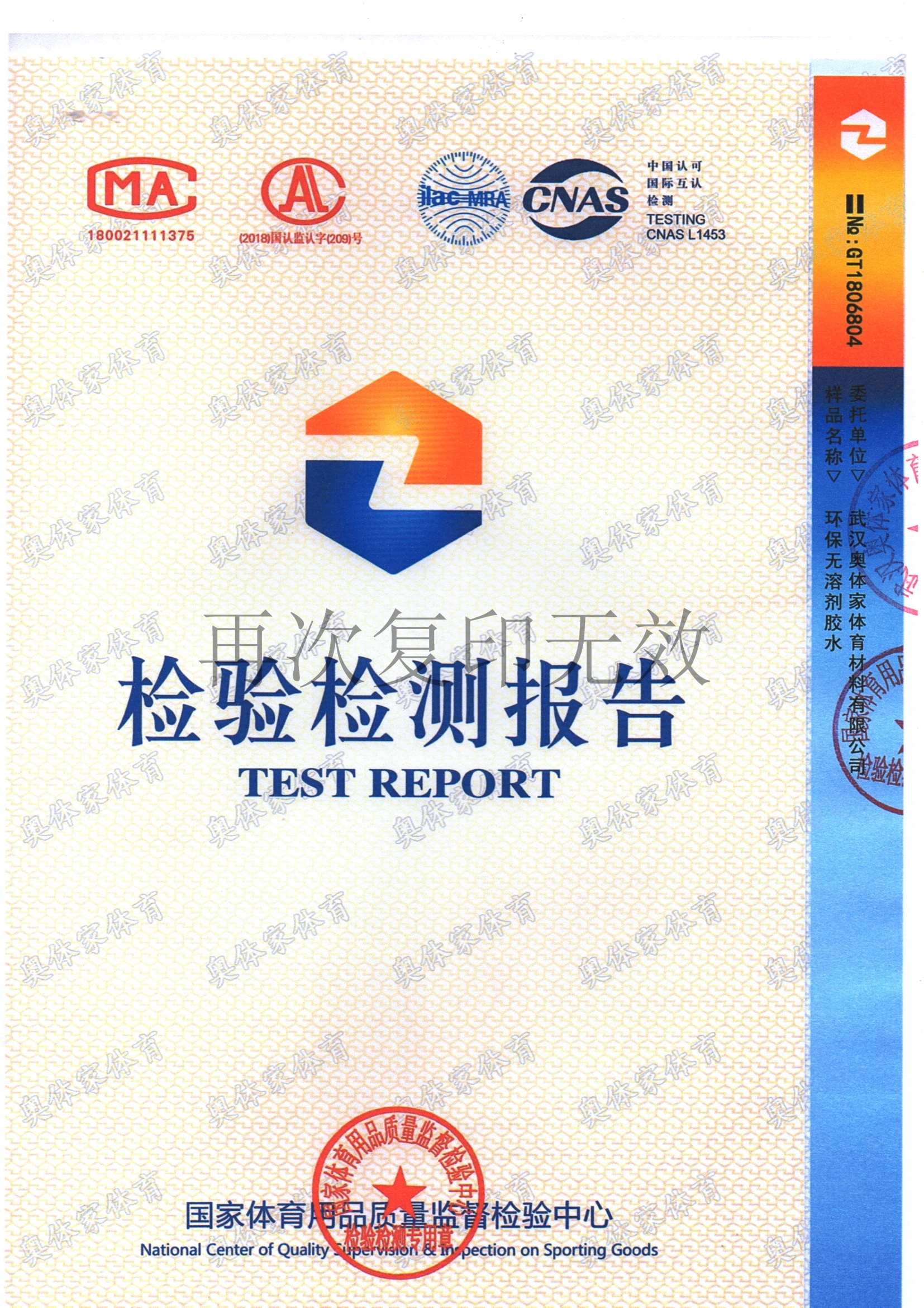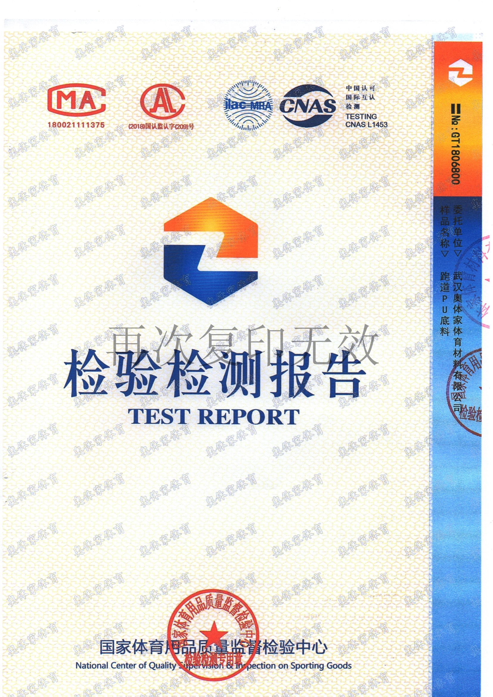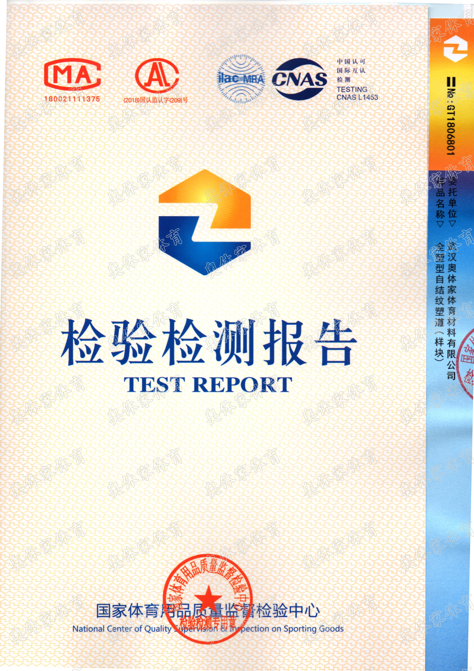 彩神新国标全塑型自结纹塑胶跑道检测报告