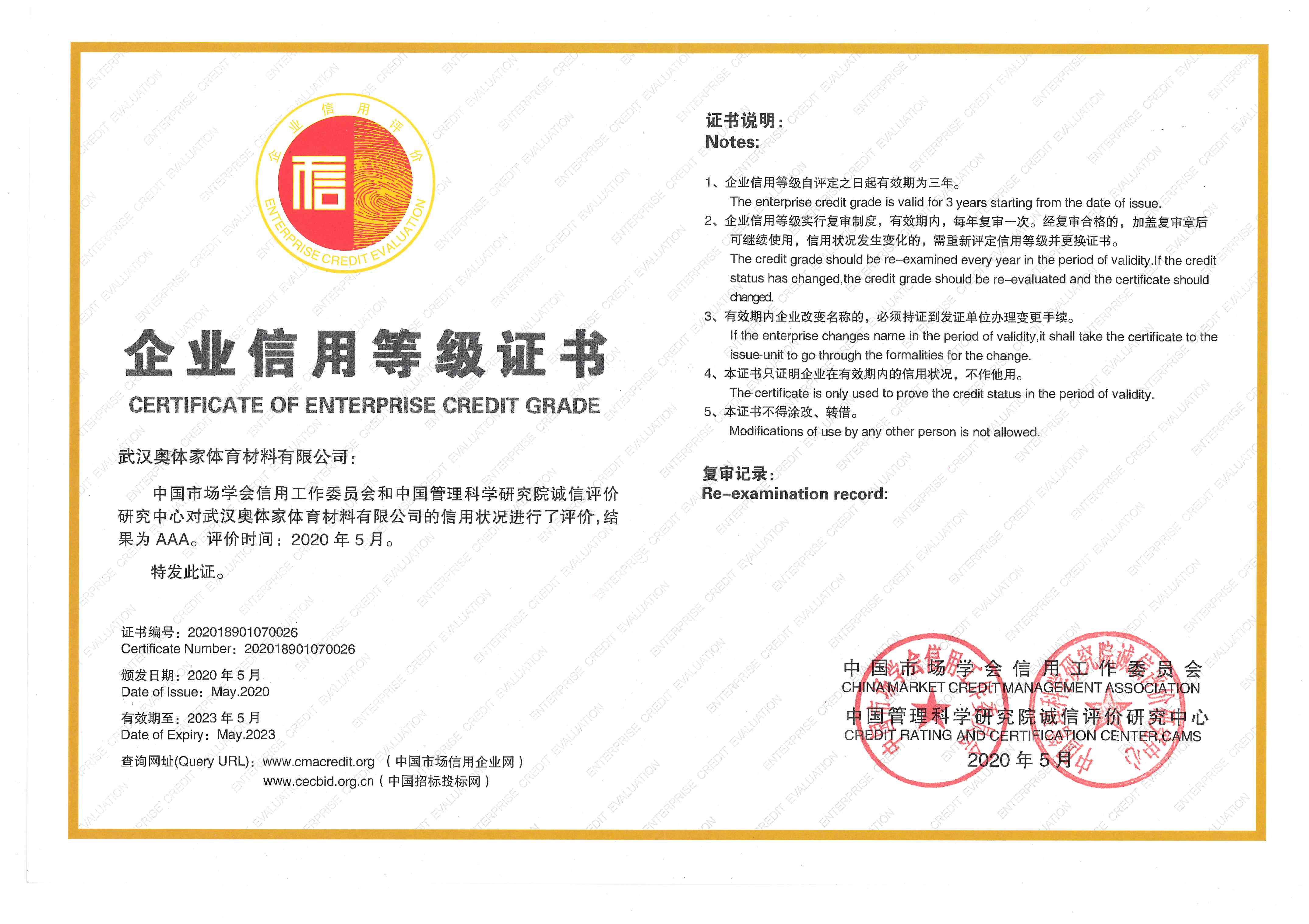 AAA企业信用等级证书